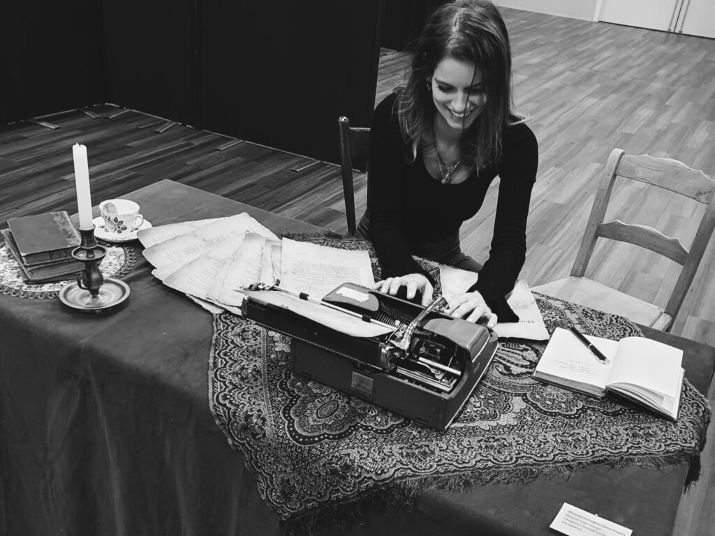 Hierboven zit ik aan het bureau dat ik creëerde voor de expositie die samengesteld is met en door mijn volledige familie.
